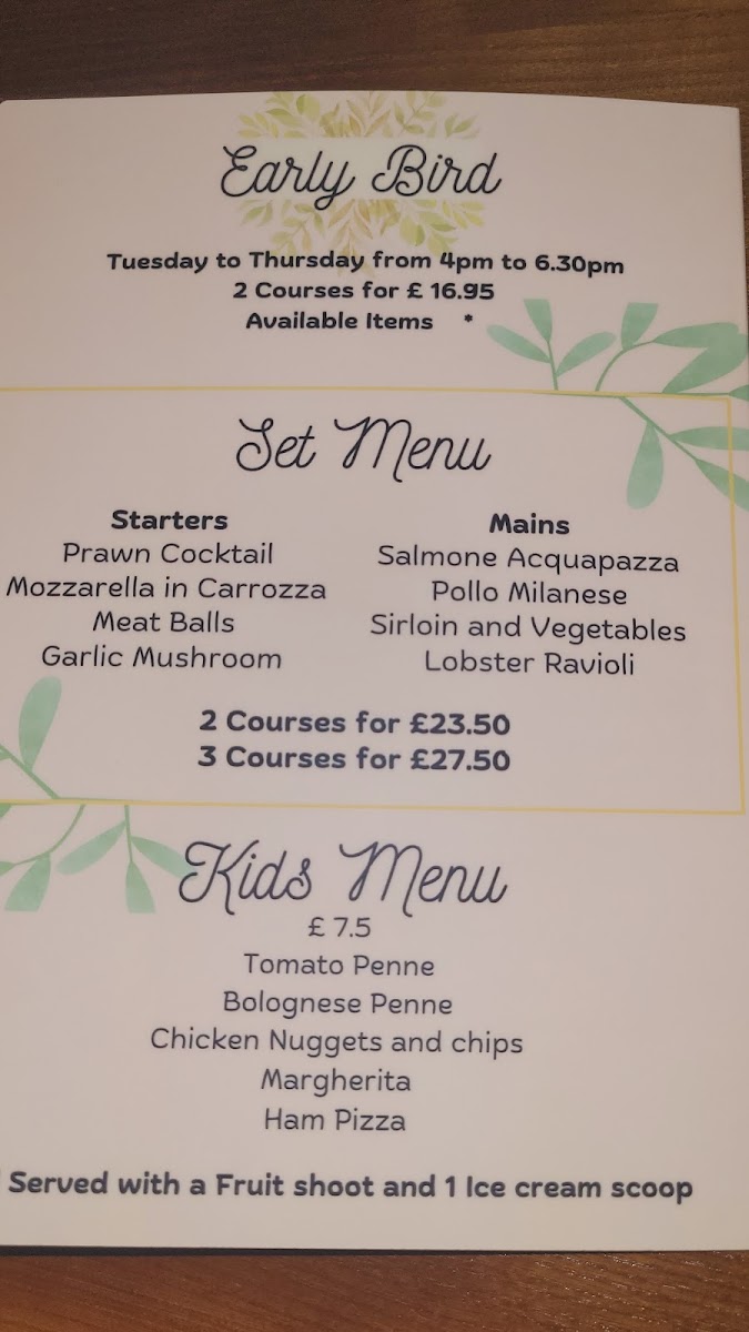 For families, the kids' menu is both delightful and diverse, including kid-approved classics like Tomato Penne, Bolognese Penne, and Chicken Nuggets and Chips. Young diners can also enjoy Margherita and Ham Pizza, ensuring that every member of the family leaves satisfied.